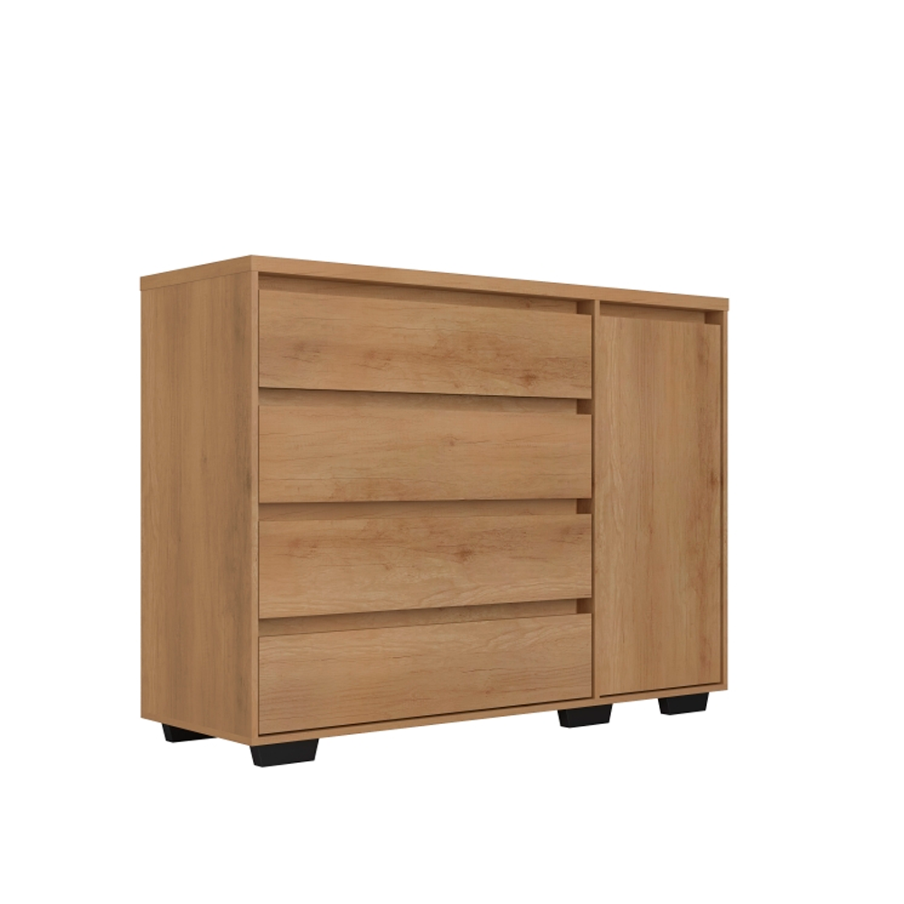 Aurora 4 Gavetas e 1 Porta combina design moderno e funcionalidade. Produzida em 100% MDF, conta com gavetas com trilhos telescópicos e porta com prateleira interna, oferecendo praticidade, organização e um acabamento elegante para o quarto.