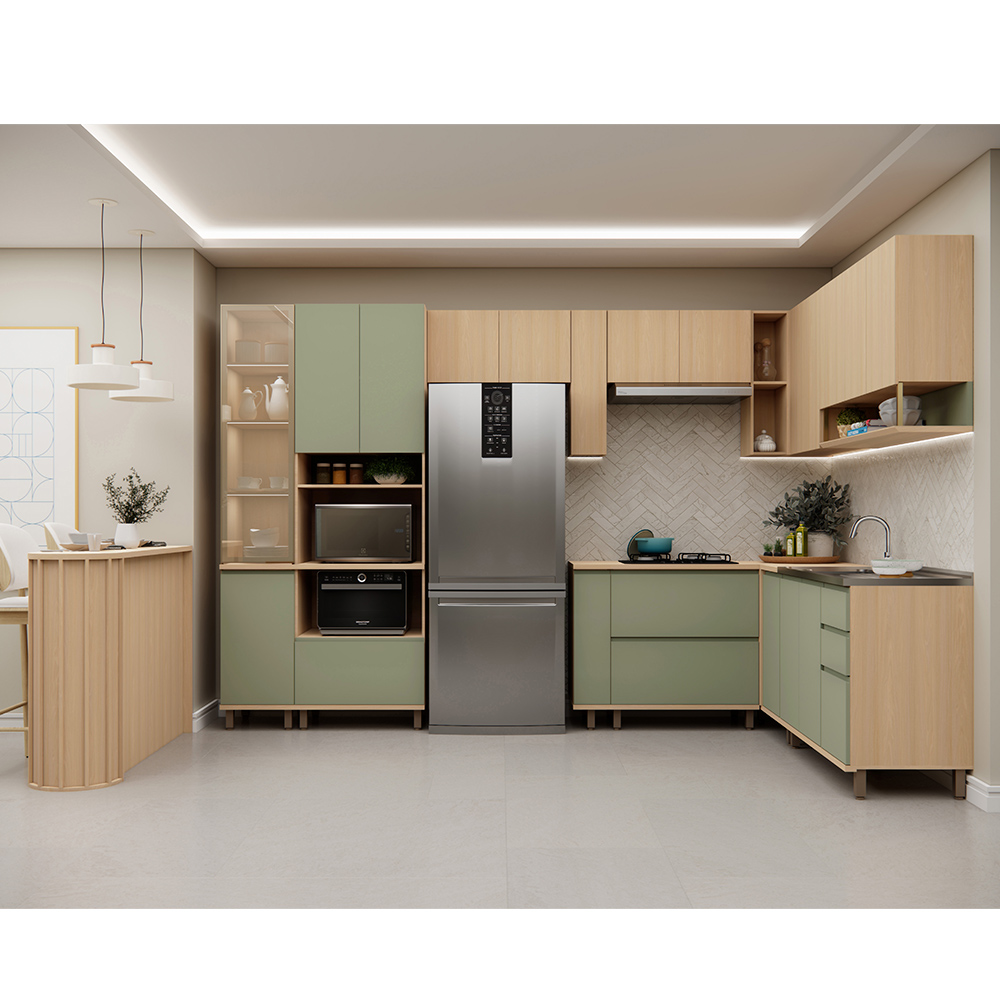 Cozinha Domus 11 Peças Carvalho com Verde une sofisticação. Produzida 100% em MDF, conta com frontais em MDF de 18mm, garantindo maior resistência, durabilidade e excelente acabamento. As portas possuem dobradiças com sistema de amortecimento, proporcionando um fechamento suave e silencioso. Os puxadores cava “J” reforçam o design moderno e minimalista, enquanto as portas de Alumínio na cor Gold com vidro reflecta Bronze agregam elegância e um toque contemporâneo ao ambiente.