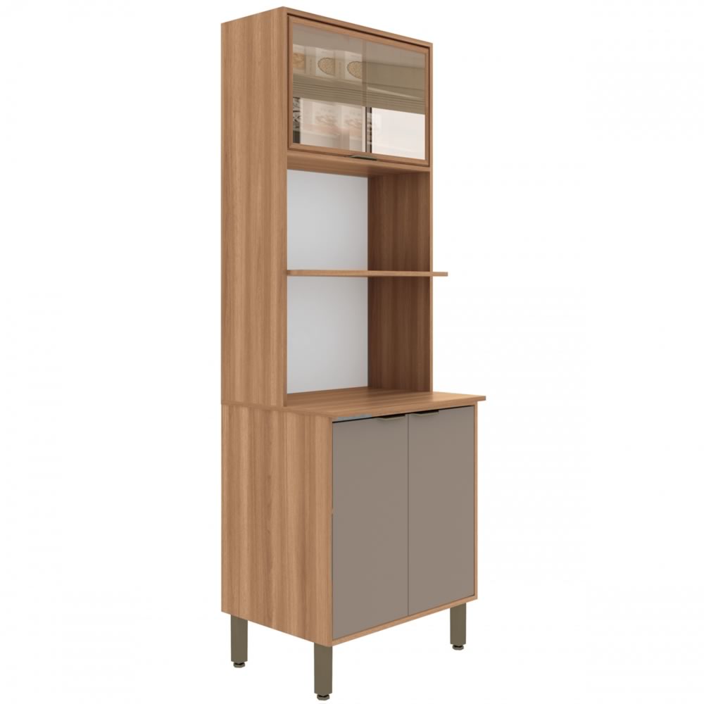 O Kit Forno e Micro Louise com Vidro oferece praticidade e elegância para a cozinha, com porta basculante com detalhe em vidro, pés com regulagem e puxadores plásticos, garantindo funcionalidade e um visual moderno para o dia a dia.