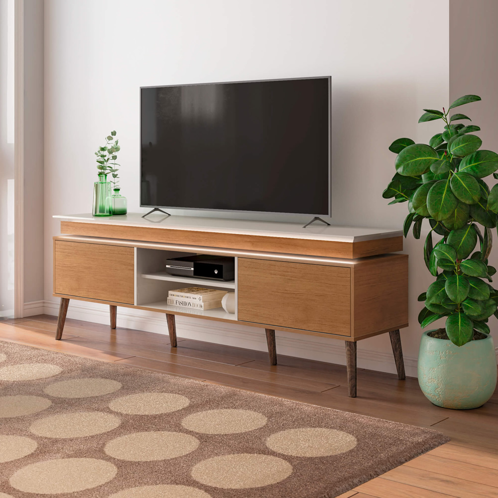 O Rack Lumina combina design moderno e funcionalidade, com iluminação em LED sob o tampo, tampo em MDF de 25mm com borda invertida. Seus pés de madeira garantem estabilidade e charme, enquanto a estrutura em MDF/MDP com pintura UV oferece resistência e acabamento sofisticado.